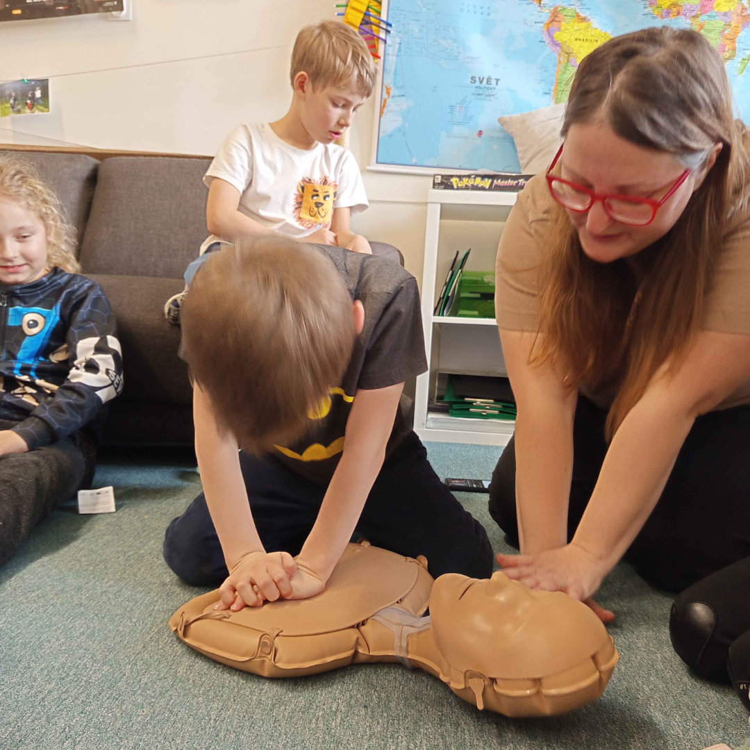 Pár momentek z projektového dne První pomoc. Inspirantíci se naučili, jak poskytnou základní první pomoc, jak si sbalit evakuační zavazadlo nebo třeba jak si právně přivolat záchranku.